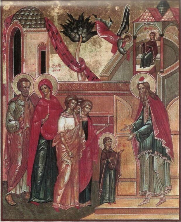 Когда Деве Марии исполнилось три года, благочестивые родители Ее приготовились исполнить свой обет. Они созвали родственников, пригласили сверстниц своей дочери и, провожаемые народом с зажженными свечами, повели Ее в Храм иерусалимский для освящения Богу. Марию подвели к ступеням Храма, а Она Сама взошла по высоким ступеням, где Ее наверху встретил первосвященник, как он встречал и других посвященных в служение Богу детей. Затем, по внушению Духа Святого, первосвященник ввел Ее в Святая Святых, куда сам имел право входить только один раз в год.